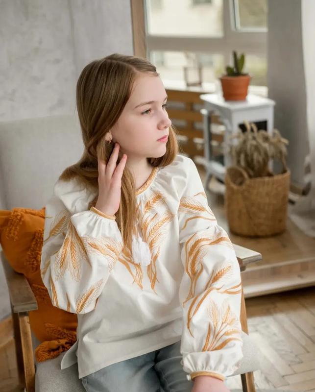 Вышиванка для девочки из белого хлопка с вышивкой носков рост 110-134 рост 140- 152 + 200 грн рост 158- 170 + 300 грн Стильная детская вышиванка из натурального хлопка, созданная для комфортной ежедневной носки и особых праздников. Вышивка в виде золотистых колисков символизирует благополучие, тепло и связь с украинскими традициями. Рукава пышные, отделаны богатой машинной вышивкой, горловина на сборке с кисточками, что добавляет нежности и легкости образу. Идеальный выбор для школьных мероприятий, фотосессий или семейных праздников. мод.луц