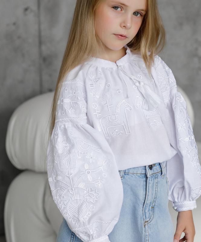 Вышиванка детская белая вышитая рубашка белым по белому в школу в садик с лошадями кузнечи...
