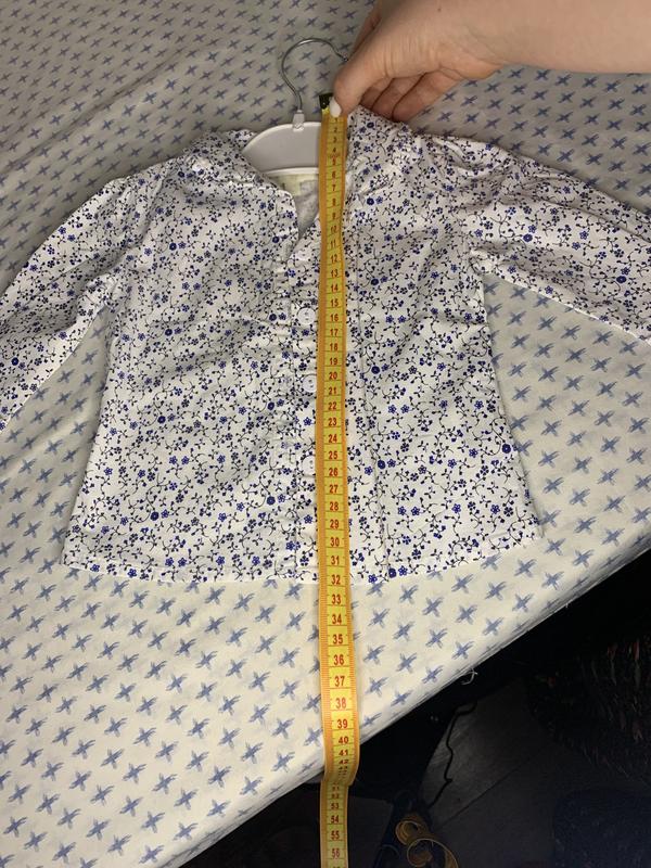 Світла блуза в квітковий синій принт на ґудзиках. По фасону схоже на сукню. Має довгі рукавчики, та комірець