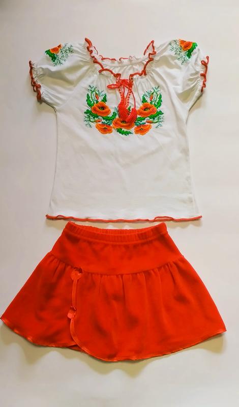 Вышиванка и юбка для девочки примерно на 2-5 лет. Лучше смотрите по замерам. Длина вышиванки-35см, ширина по груди-28см. Длина юбки-24см,ширина по поясу-21см, (тянется до 34см). Цена 280грн.