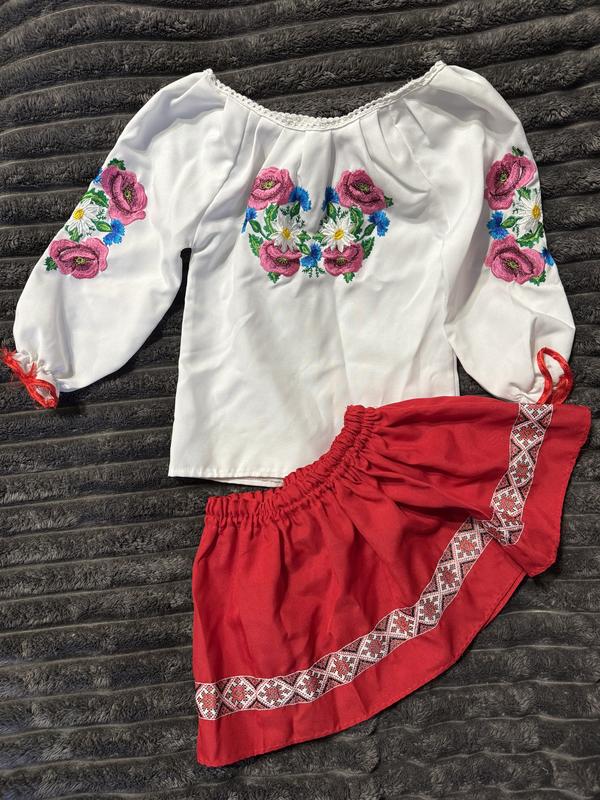 Дитяча вишиванка,можна купити і спідницю (дивіться оголошення) Довжина від плеча 43см Груди 33см Рукав 39см З дефектів трошки полізла стрічка на рукавах