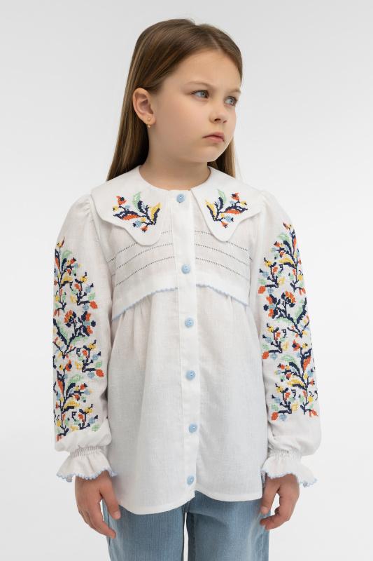 Нежная вышиванка детская для девочки с разноцветным цветочным орнаментом станет украшением праздничного гардероба. Модель отличается от других интересным отложным воротником с вышивкой, обильно украшенными рукавами и декором в виде кружева, голубых пуговиц. Вместе это создает гармоничный образ, стилизованный под традиционную национальную одежду. Растительный орнамент на рубашке, который выполнен в технике крестик, демонстрирует красочность, разнообразие украинской природы, но при этом вышитые цветы служат оградом для ребенка, защищают его от отрицательной энергии. Купить вышиванку для девочки стоит и за высокое качество исполнения и оптимальную по составу натуральную ткань, которая состоит из льна и хлопка. Такая материя чрезвычайно приятная к телу, она дает возможность коже дышать, и при этом выглядит великолепно, не мнется, не вытягивается. Купить вышиванку для девочки с растительным орнаментом от производителя предлагает купить на выгодных условиях стильные и качественные современные вышиванки на девочку. Предложенная модель имеет множество преимуществ и особенностей, которые стоит отметить: качественная натуральная, гипоаллергенная и износостойкая ткань, которая на 50% состоит из льна, 50% из хлопка; цветочная стилизованная вышивка на белом полотне делает изделие нарядным, праздничным, хотя он прекрасно впишется и в повседневный гардероб; актуальный сейчас свободный крой рубашки позволяет ее сочетать с джинсами, брюками и юбками, он чрезвычайно комфортен для детей; длинный прямой рукав щедро украшен цветочной вышивкой, к низу он прибирается на резинку; оригинальный воротник с закругленным волнистым краем добавляет элегантности, нарядности вышиванца; застегивается рубашка на голубые пуговицы, что удобно и практично; верхняя часть изделия на передней планке украшена нежной сеткой.