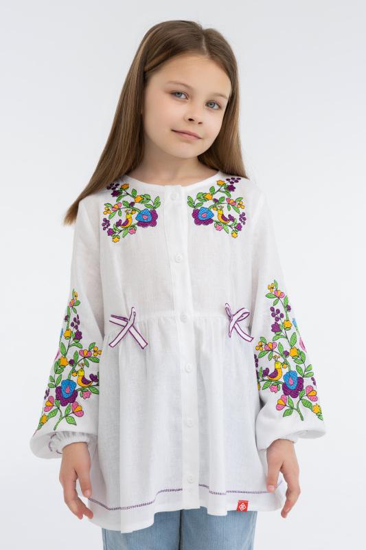 Яркая и разноцветная вышиванка на девочку, которая стилизована под древней вышивкой, станет украшением праздничного, торжественного образа ребенка. Рубашка имеет оригинальный крой и свободный, комфортный силуэт, который к низу расширяется. Шарма изделия добавляют милые бантики и кружева, выполнена в контрастном цвете. вышивка XX вт отличается от других своей необычной фактурностью, яркими красками и растительным и животным орнаментом, создавшим настроение праздника, придавшим очарования девичьей красоте. Этим фейерверком красок и вдохновлялись мастера при создании вышиванки на девочку. Орнамент модели включает в себя изображение очаровательных цветов, ягод и птичек, которые выполнены уникальной техникой – “качалочка”. Благодаря ей становится возможным создание текстурированного узора. Неповторимые вышиванки на девочку от производителя Купить вышиванку на девочку стоит за ее оригинальный дизайн, высокое качество исполнения и другие особенности, характеристики: оптимальный состав ткани – она на 100% натуральная и приятная к телу, состоит в равных пропорциях из льна и хлопка; материал обладает превосходными показателями по воздухопроницаемости, гигроскопичности, он является гипоаллергенным и при этом не мнется сильно, не теряет форму, не извлекается; длинный широкий рукавчик щедро украшен вышивкой с цветами и птицами, заканчивается он декоративной строчкой кружева и резинкой; застегивается рубашка на белые, незаметны на первый взгляд пуговицы, которые добавляют практичности и удобства изделию; лаконичная округлая горловина выглядит удивительно элегантно, женственно; линия талии является отрезной, имеет декор в виде милых бантиков; вышиванка имеет свободный, удлиненный крой, по низу ее декорировано строчкой кружева фиолетового цвета; изделие легко интегрируется в современный гардероб девочки, сочетается с джинсами, брюками, юбочками.
