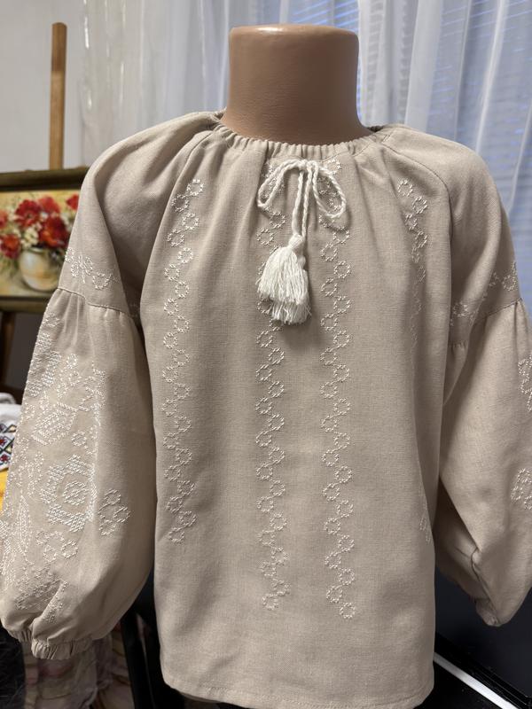 Сорочка вишиванка для дівчинки. Колір бежевий, тканина 90% лен, 10% поліестер.. Етно колекція фабрика Бембі. Розмір 122, але може бути на 110-116 ріст. Машинна вишивка, однотонна. Має традиційний крій з новітніми елементами.
