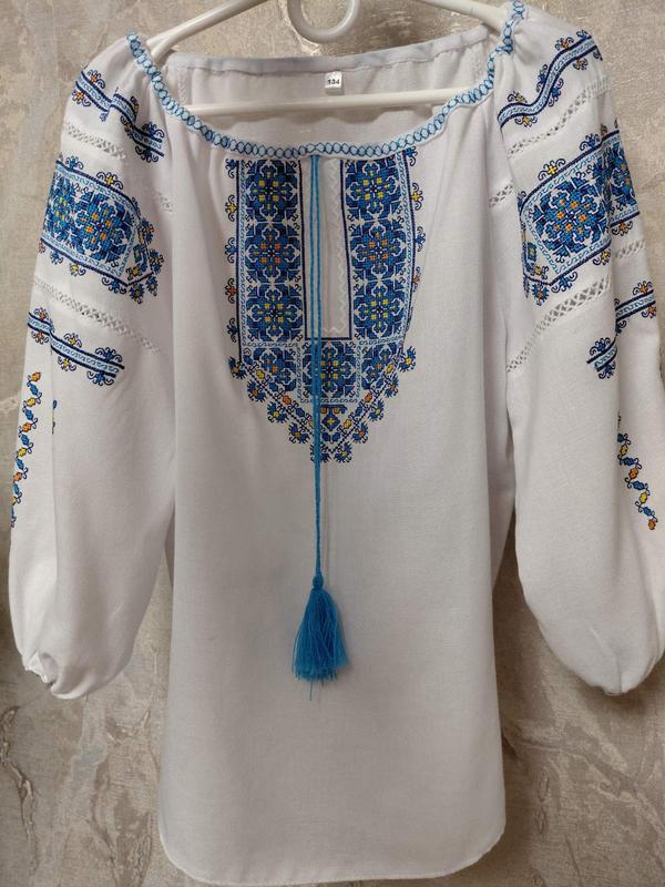 Качественная, классная вышиванка для девочки из натуральной ткани Состояние - идеальный. Рукава в 3/4, что очень удобно. Сначала на вырост будут длинные, затем в 3/4 😁. Горловина затягивается на шнуровке, что тоже удобно берет на пару лет 🙂 Длина от горловины - 47 см Полуобхват груди - 42 см Длина рукава от горловины - 42 см