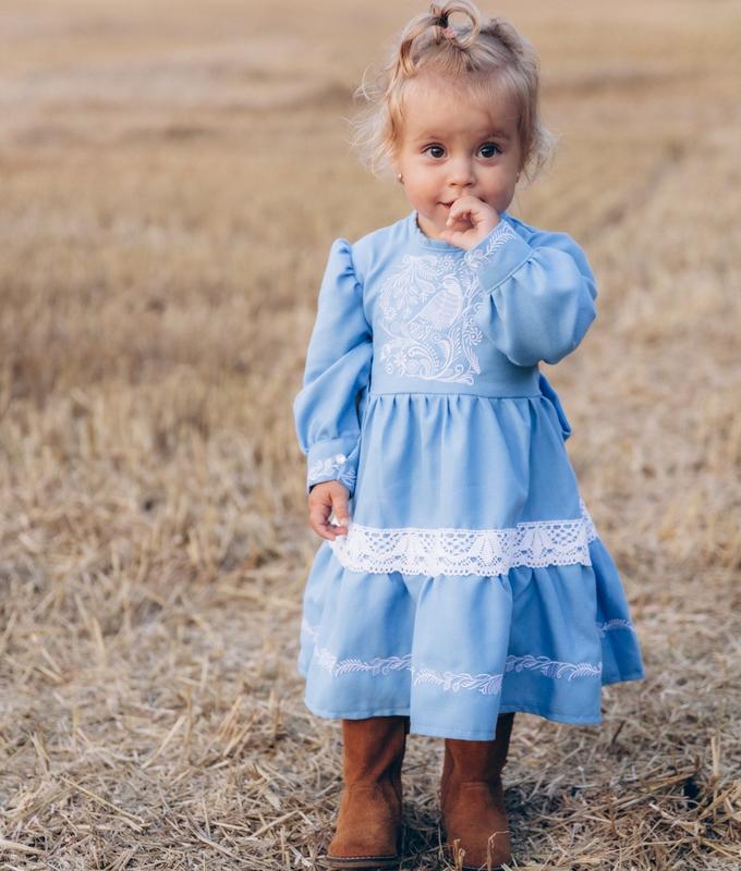 Сучасна вишита сукня для дівчинки. Виготовлена на якісному домотканому полотні. Оздоблена вишивкою білого кольору. Головним елементом орнаменту є птаха. Птаха символізує любов та є оберегом сімейного затишку. Розмірний ряд: 98-152