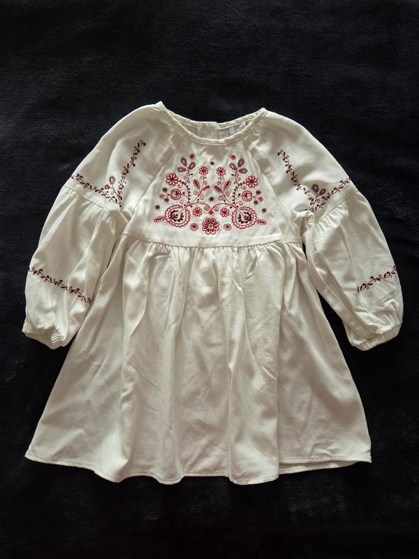 Очень красивое вышитое платье, выполненное из мягкого льна, машина вышивка. Было одето 2 раза, состояние новой, без дефектов. Размер 110, замеры: рукав реглан от горловины 42см, длина рукава под рукой-28см, длина по спинке - 54см, ширина под руками - 30см.