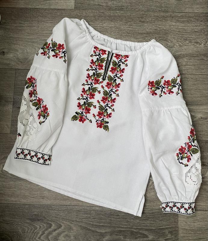 Вишиванка на зріст 134 см в дуже хорошому стані. Є плямка збоку, розійшовся шов на рукаві біля гудзика (всі недоліки є на фото). Заміри: довжина 53, ПОГ 40,5, рукав 54.