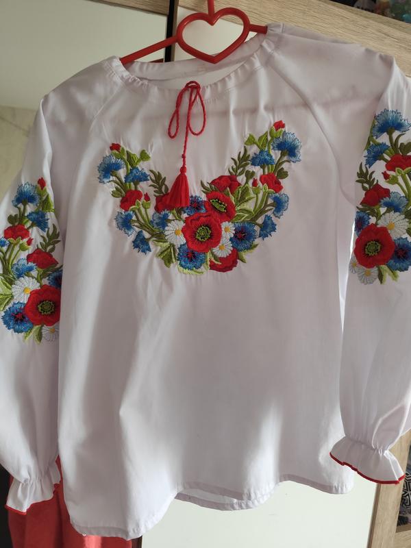 Вишиванка маки, волошки, ромашки у відмінному стані 134-146 см. Заміри :довжина виробу 55 см, ширина від пройми до пройми 40 см. Зручна модель, рукава на гумці, тому зру но регулювати по зрісту на дитині.