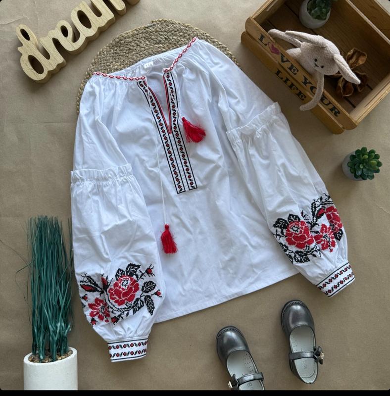 Неймовірна вишиванка - виробництва Україна! Малюнок - вишивка нитками! Якість - чудова! Тканина - бавовна. Рукав оздоблено вишивкою, застібається на ґудзик. Розміри: 140 - рукав від горловини 58/ довжина 54/ півобхват грудини 43 146 - рукав від горловини 61/ довжина 56/ півобхват грудини 44 152 - рукав від горловини 64/ довжина 58/ півобхват грудини 46 158 - рукав від горловини 66/ довжина 61/ півобхват грудини 47 164 - рукав від горловини 70/ довжина 63/ півобхват грудини 49 170 - рукав від горловини 72/ довжина 65/ півобхват грудини 50 176 - рукав від горловини 74/ довжина 67/ півобхват грудини 51 Ціна: 1070 грн Крохпелька