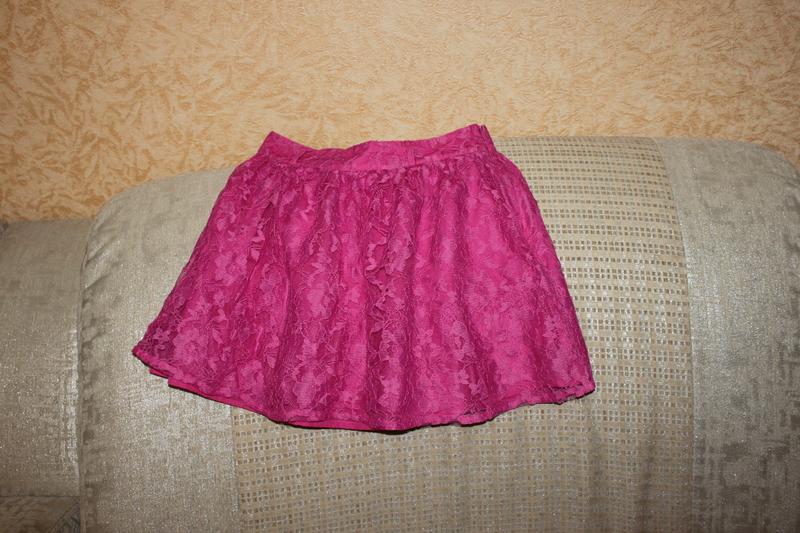 Очень красивая и нарядная юбка девочке 9-11 лет от Young Dimension. Внутри подклад, а сверху кружево. Сбоку застегивается на молнию. Без дефектов - одевали на праздник и пару раз погулять. Замеры: ПОТ 31см, длина 37см.