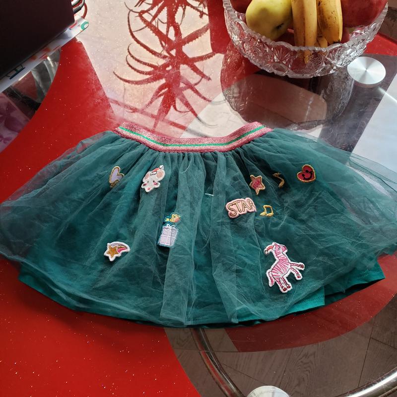 M&S пышная юбка туту пачка фатин зеленая девочке 5-6 л 110-116 см Состояние идеальное Внутри хлопковая подкладка. Пояс эластичный, блестящая резинка, на верхнем слое разные яркие нашивки впереди. Юбка нарядная, подойдет как дополнение к праздничному наряду, на День рождение, Рождество, Новый год, фотосессию, любое торжественное событие. Можно надеть на новогодний утренник, костюм елочки. Можно также носить каждый день, с простыми уолготками, лосинами, лонгсливом, футболкой, например.