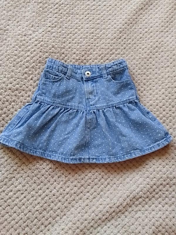 юбочка из светлого джинса в белые точки, с кармашками, застежкой замочком и резинкой в поясе. Указан размер 110 на 4-5 рочков. Длина 27 см., обхват по поясу 53 см.