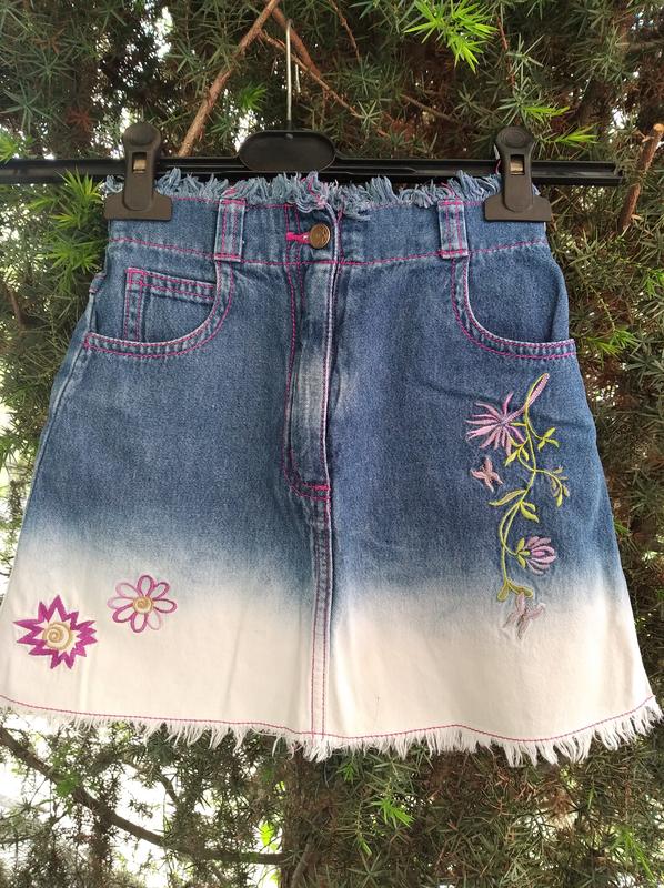 гарна синьо-біла джинсова спідниця,з кишенями спереду та позаду,малюнок вишитий,позаду резиночка. Виробник Туреччина Заміри: довжина-30/об'єм по резинці-25, тягнеться до 32см