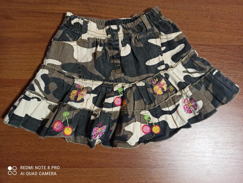Комуфляжная юбочка. Есть два кармашка. На подоле аппликации.