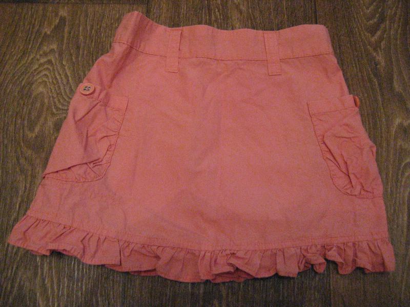 Легкая юбочка кораллового цвета с оборкой и карманами.