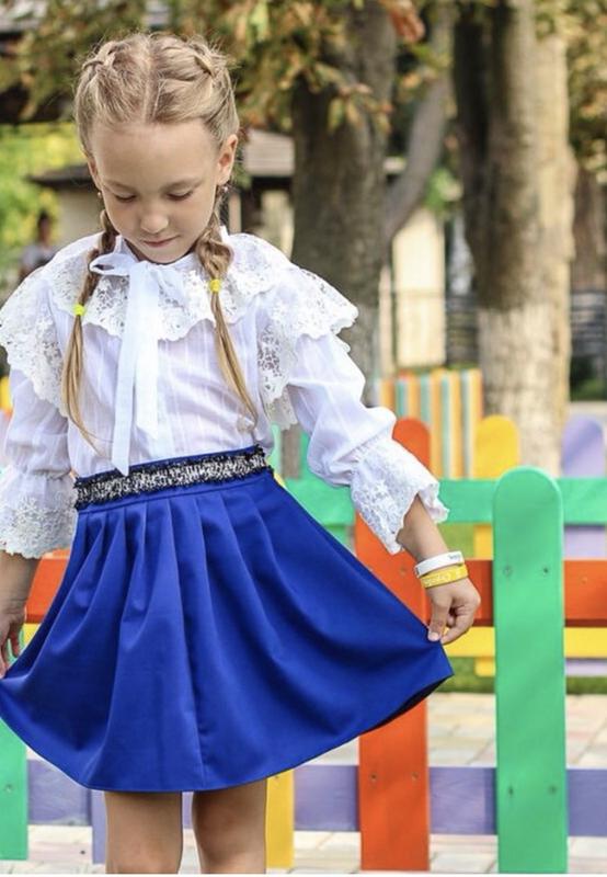 Дитяча спідниця,виповнена із костюмної тканини,шліфована,переливается,з декором на талії,має резинку-регулятор