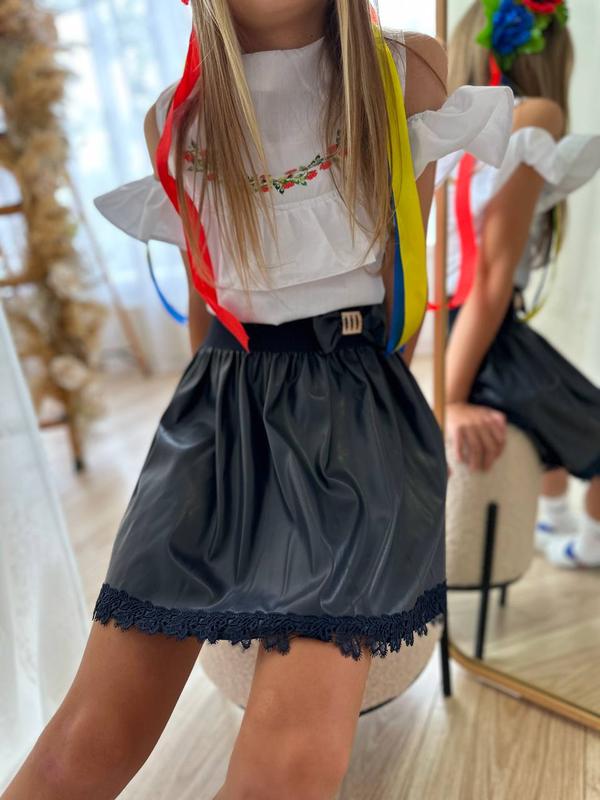 Юбка школьная отличного качества! Материал- экокожа высокого качества, снизу украшена кружевом. В поясе- широкая резинка. Замеры: XS (6-7 лет)- длина 29 S (7-8 лет)- длина 33 M (8-9 лет)- длина 35 L (9-10 лет)- длина 37 Цена: 425 грн