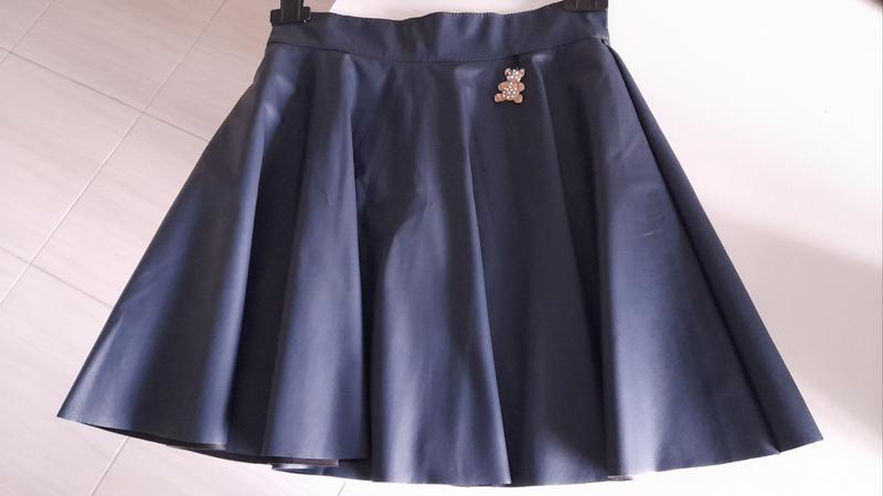 Юбка из экокожи, темно-синего цвета(як на фото 1), застежка замок, длина 42см, талия 68см. Подойдет на все фигуры, примерный возраст 7-9 лет, но ориентируйтесь по замерам. Замок рабочий, легко застегивается и не расходится при ношении