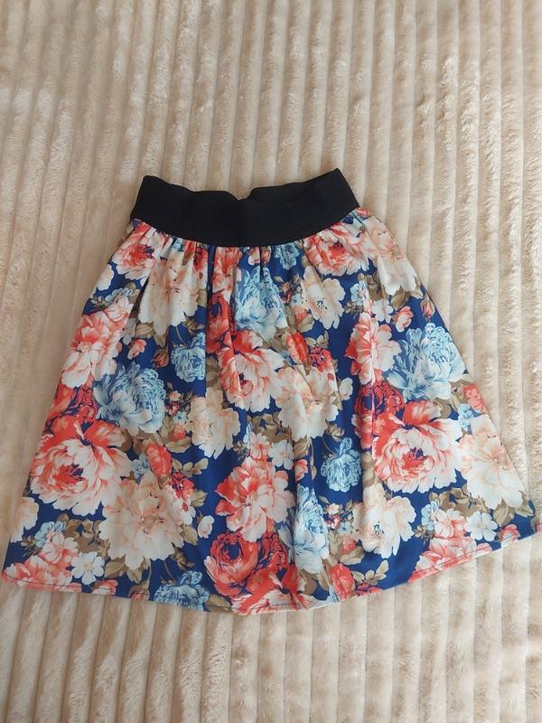 Спідничка в квітковий принт Напівобхват(по чорній резинці 30 см), гарно тягнеться. Довжина 48 см. Маючи М розмір, спокійно в неї влажу