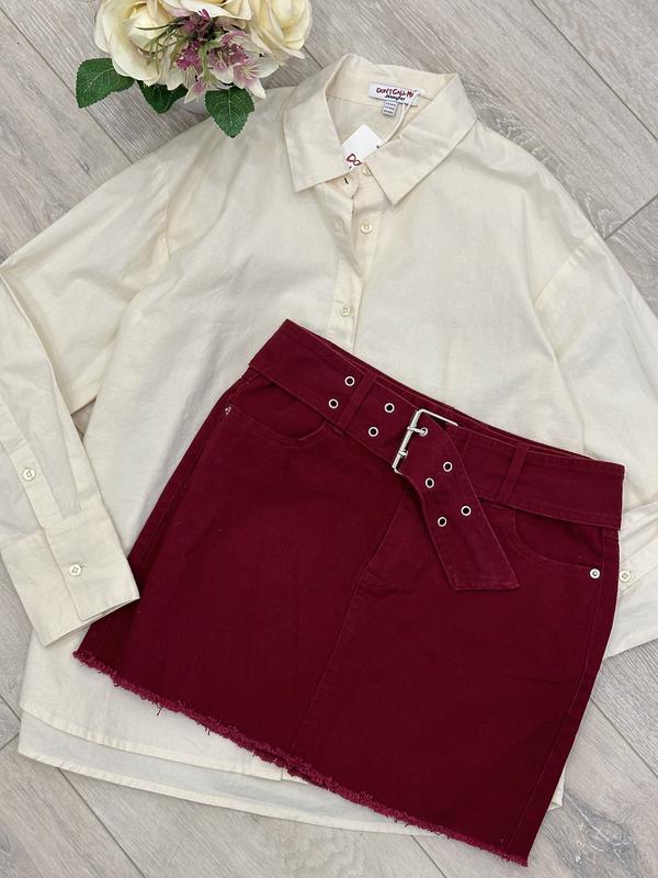 Котонова спідниця з широким пояском має кишені Застібка гудзик та блискавка Колір бордо Розмір 30 зріст 150-160 см Заміри Довжина 35 см Стегна 43 см Пояс 35 см