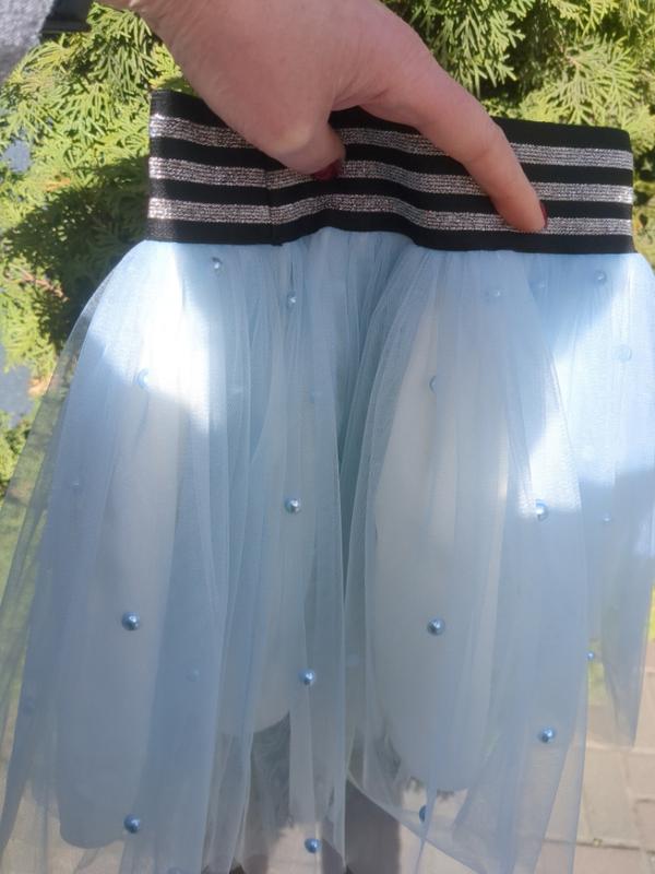 нежно голубой цвет, юбка имеет юбку, украшенную жемчужинками.пот.-24см(без натяжки) длинн.-35см(разом с поясом).