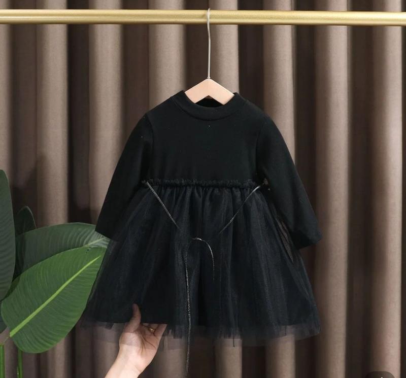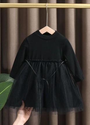 Стильное элегантное платье для девочки.Новое.Цвет черный.Верх платья- хлопковый трикотаж,низ - подъюбник и сетка сверху.Есть тонкий лаковый поясок по бокам изделия.Все замеры указаны на фото.