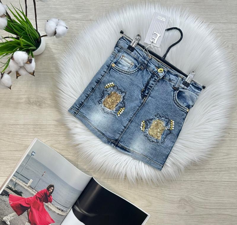 Крутецкая джинсовая юбочка с жемчужинками и пайетками 😍🤩😍 Мастхэв на лето 🔝🔝🔝 Стильовые потертости в средние с пайеткой😎 Перлинки на ніжці 👌🏻 В поясе есть утяжка 😉 Тканина: джинс Производитель: Турция 🇹🇷 р.9/10 лет -1шт ЗАМІРИ ⤵ р.9/10– длина 28см/ ширина пояса 29см