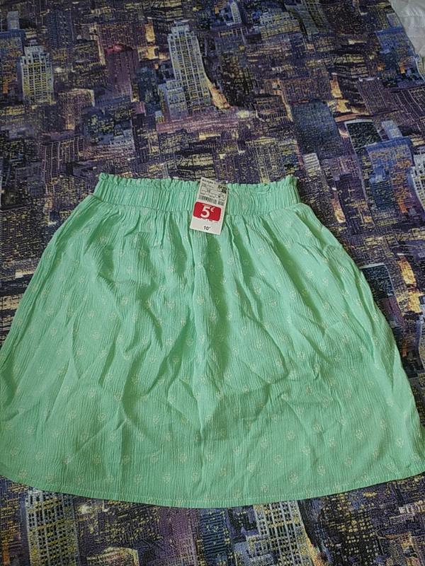 Легкая юбка нежно бирюзового цвета с белыми цветками на широкой резинке. Состав 100 вискоза. Указан размер 10 138/143 Замеры длина 40, нот по резинке в спокойном состоянии 29.