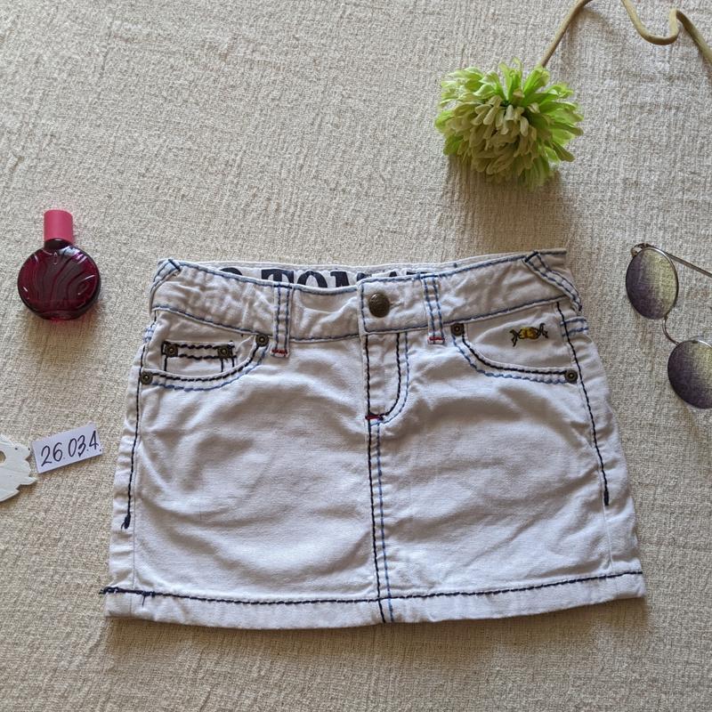 біла спідничка з контрастною відстрочкою пояс в спокійному стані 30 до 35 є резинка утяжка в бедрах тягнеться до 41 , бок шов 26,5