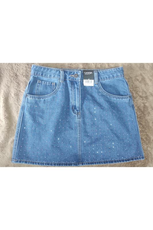 Джинсовая юбка, весь перед украшен цветными стразами. В талии есть утяжка.