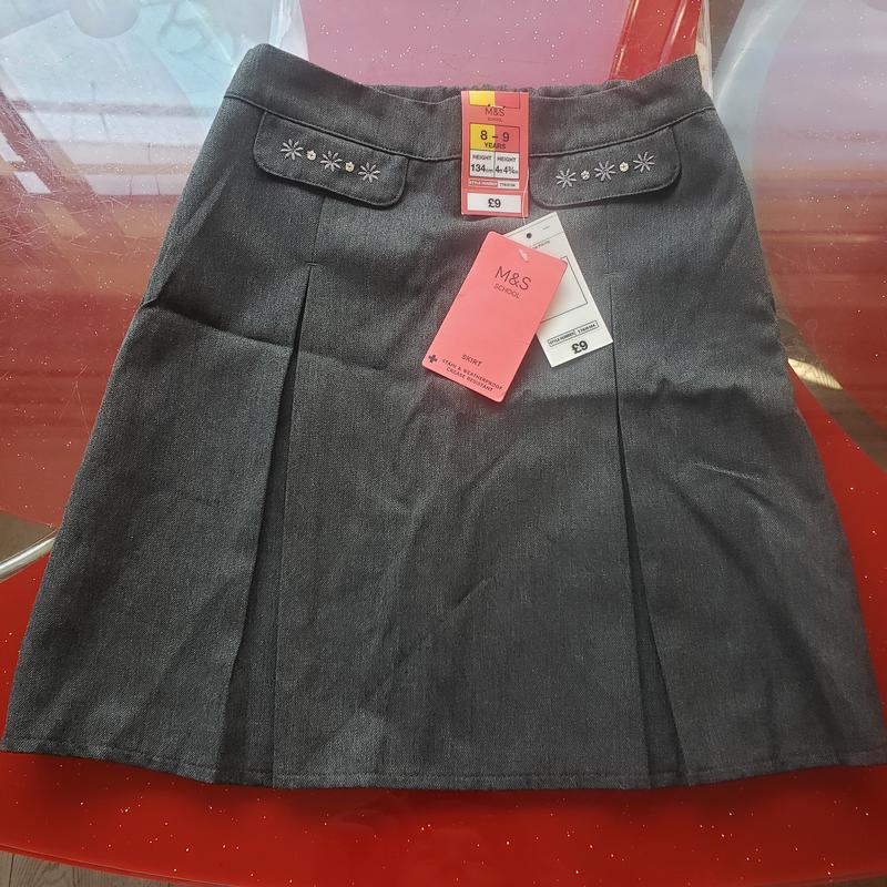 M&S юбка серая школьная девочке 8-9л 128-134см Новая, с бумажной биркой длина 39.5 см, пот 28.5/34.5 65% полиэстер, 35% вискоза впереди 2 кармана, украшены вышивкой застежка збоку на молнию сзади вшита на талии резинка