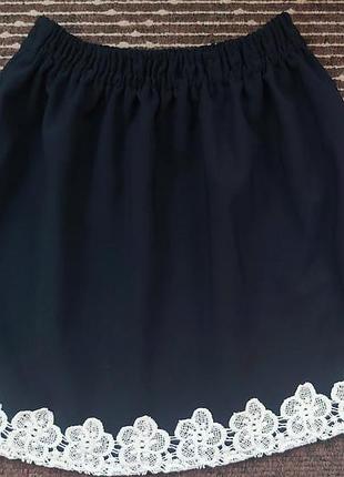 Юбка для школы для девочки. Темно-синего цвета с кружевом по краям. На резинке, соответственно хорошо тянется. На возраст 7-9 лет. Цена символична. Замеры: длина - 39 см, пояс-резинка 26 см.