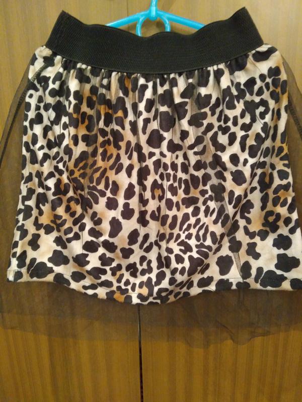 Юбка в леопардовый принт, сверху сеточка, пояс резинкой. Замеры: талия-29, тянется до 34, длина-38, сеточка на 5 см длиннее, бедра свободные( до 50 см)