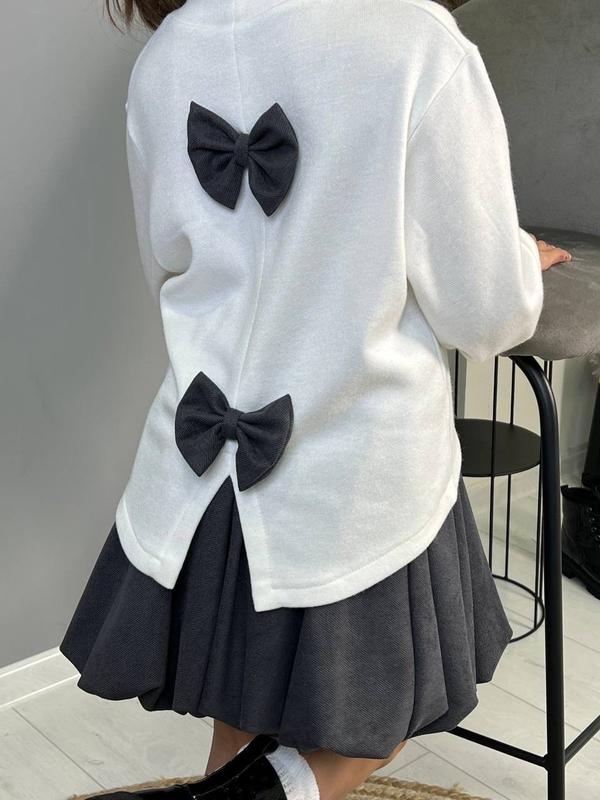 Комплект для девушек; - Состоит из кофты и юбки-баллон мини; - Кофта декорирована бантиками и разрезом на спинке; - На поясе широкая резинка; - Юбка с тонким подкладом.
