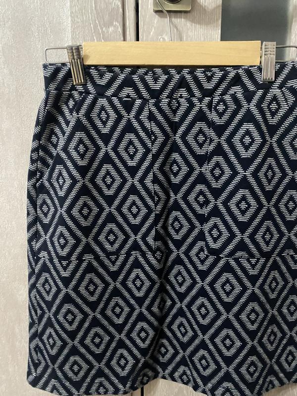Стильная юбка известного бренда “Next в геометрический принт. Размер 8/36, но подойдет на М.Очень приятна на ощупь, состояние идеально. По составу: вискоза, немного полиэстру и эластана, тянется. Имеет две накладные карманные спереди, пояс резинка. Цвет темно синий, ближе к черному, принт светлый Длина изделия -49 От- 35(без растяжения) Об- 46