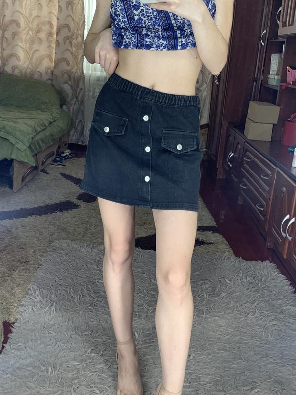 Нова (з біркою), на поясі має резинку. Вивареного чорного кольору. Кармани – обманки. Тканина гарно тягнеться. До 160 см зросту. Розмір – ХС. Приміряна на зріст 158 см.