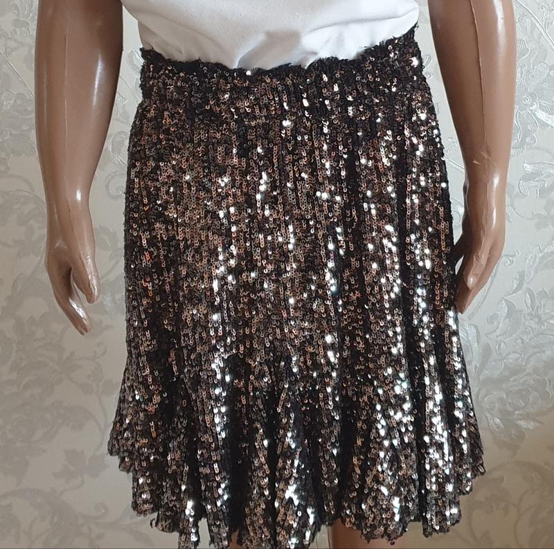 спідниця в паєтках на широкій резинці для дівчинки 8 -10 років колір чорний паєтки бежеві та сріблясті матеріал нейлон підкладка чорна матеріал котон виробник Марокко зріст 140 см о/ талії 50 см довжина виробу 38 см