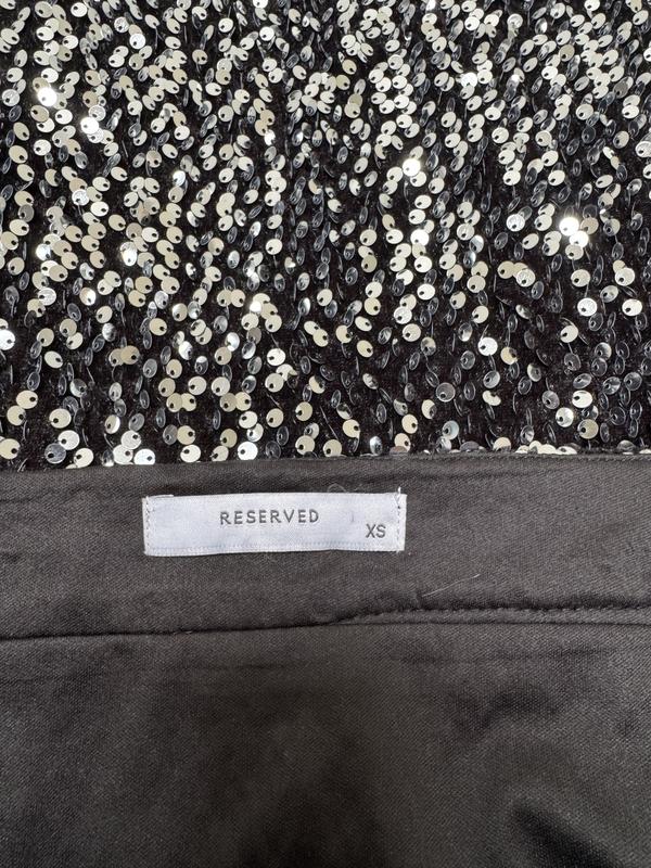 Черная юбка трапеция в серебряные пайетки. Имеет посадку на талии. Застегивается на застежку-молнию.