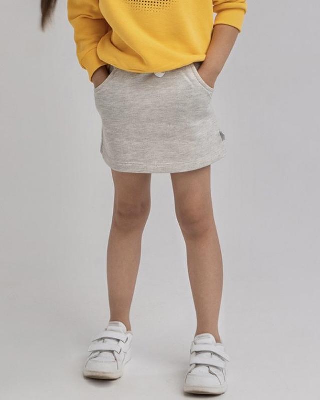 Юбка для девочки, трикотаж тринитка серый меланж. Юбка прямого силуэта, по вершине притачной пояс, передняя половинка с боковыми карманами, пояс из основной ткани, внутрь которого вставлена резинка и шнурок. Пояс-22см, бедра-32см, довжина-30см.
