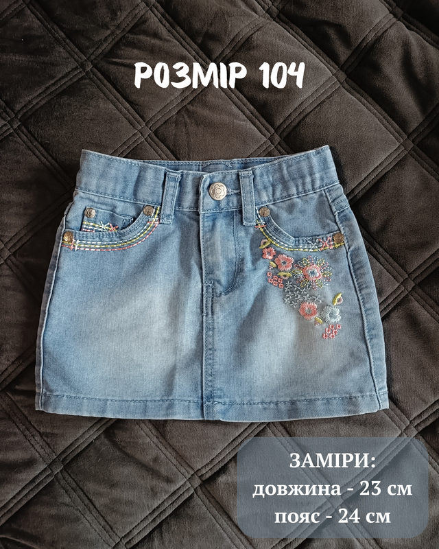 Джинсовая юбка для девочки в голубом цвете с вышивкой. Сзади два накладных кармана. На поясе есть утяжка. Идеальное состояние. Замеры на фото