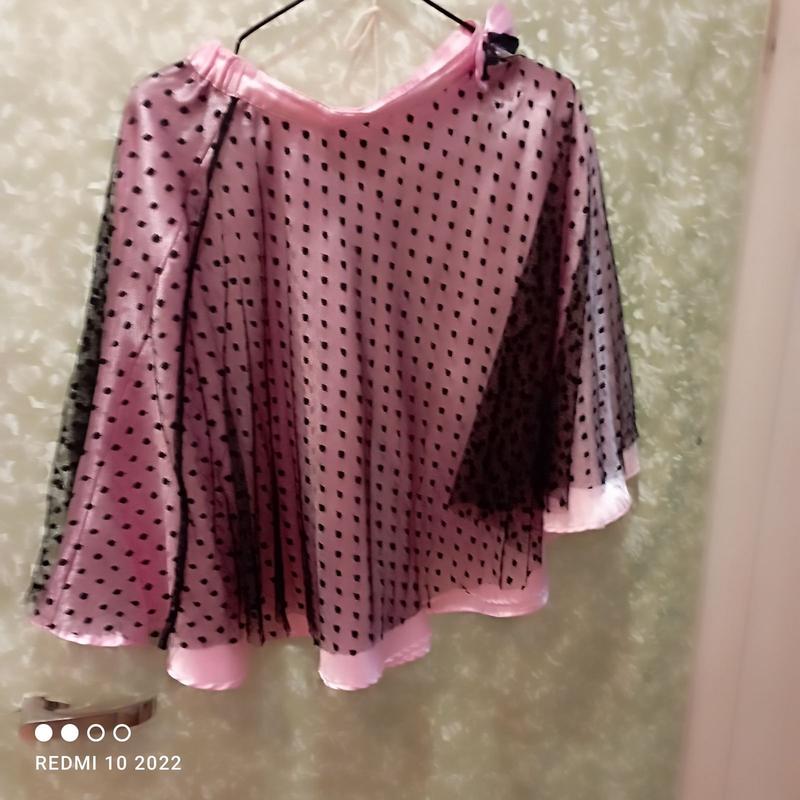 юбка шёлковая розового цвета подкладка длина 53см,сверху чёрная гипюровая 49,талия неполностью резинка ПО талии 30,в растянуть виде 37.