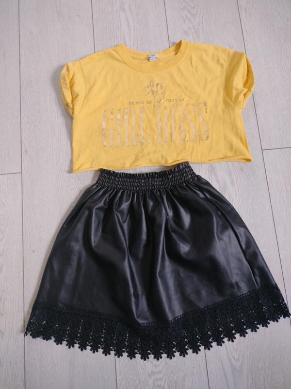 юбка из экокожи, снизу украшена кружевом.пояс на резинке, тянется с 26 до 52 см полуобхват. Длина юбочки 40 см Носилы на рост до 152 на праздник в музыкальную.Уже короткая.
