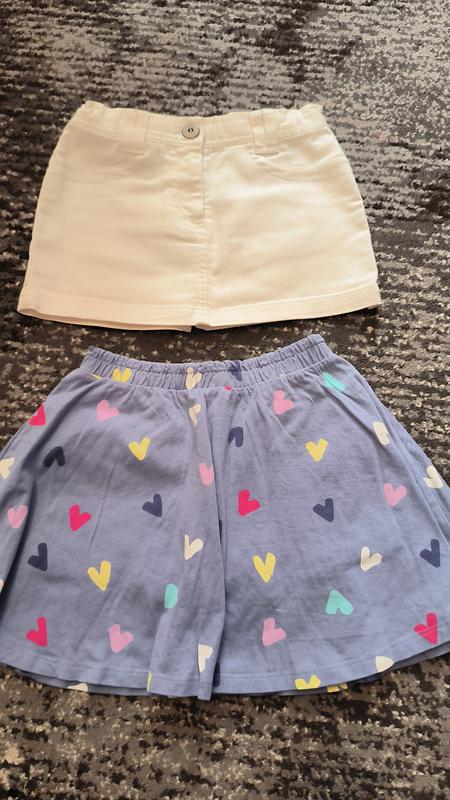 Две юбки на девочку 110/116 состояние идеально Белая юбка, джинсовая Пояс регулируется резинками Длина 24 Синяя юбка шорты с сердечками Длина 29 пояс 24 Цена за все