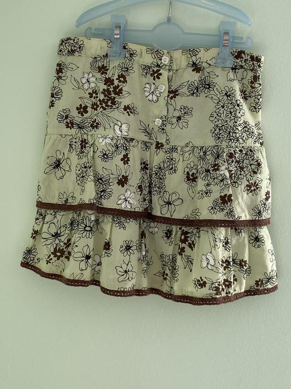 Мини-юбка с цветочным принтом Цена: 120 грн Состояние: Идеальный, без дефектов Нежная летняя юбка с цветочным принтом в стиле бохо. Приятный светло масляный цвет с коричнево-белыми цветами, легкая многоярусная форма и декоративная тесьма делают эту модель универсальной и удобной.