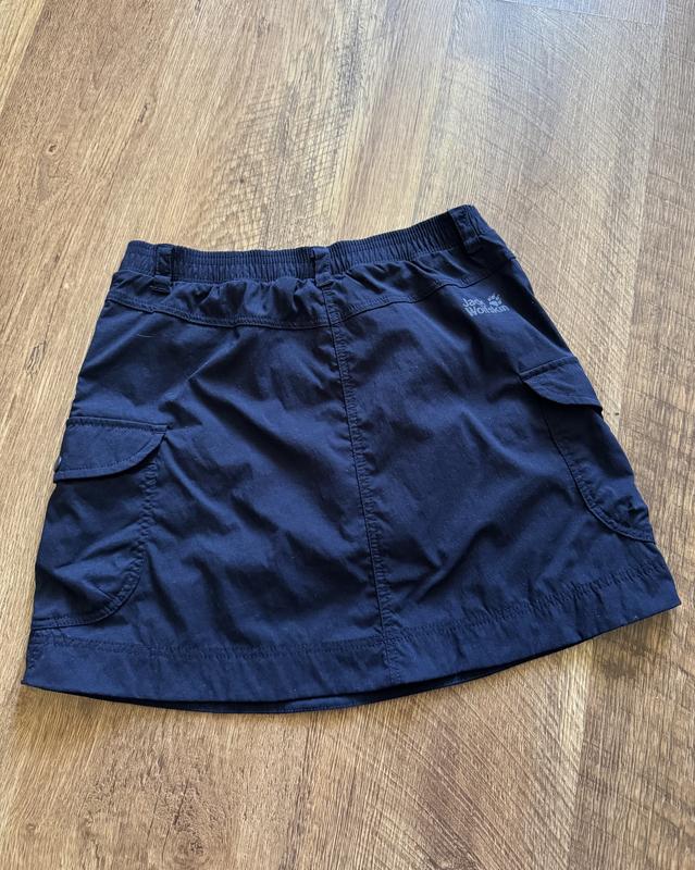 спідниця-шорти (скорт) Jack Wolfskin, модель "Treasure Hunter Skort", призначена для дівчаток. Jack Wolfskin — це німецький бренд, що спеціалізується на виробництві одягу, взуття та спорядження для активного відпочинку та туризму. Їхня продукція відома своєю функціональністю, довговічністю та пристосованістю до різних погодних умов. Ця спідниця-шорти, судячи з зовнішнього вигляду, має кишені та еластичний пояс, що робить її зручною для активних ігор або походів.