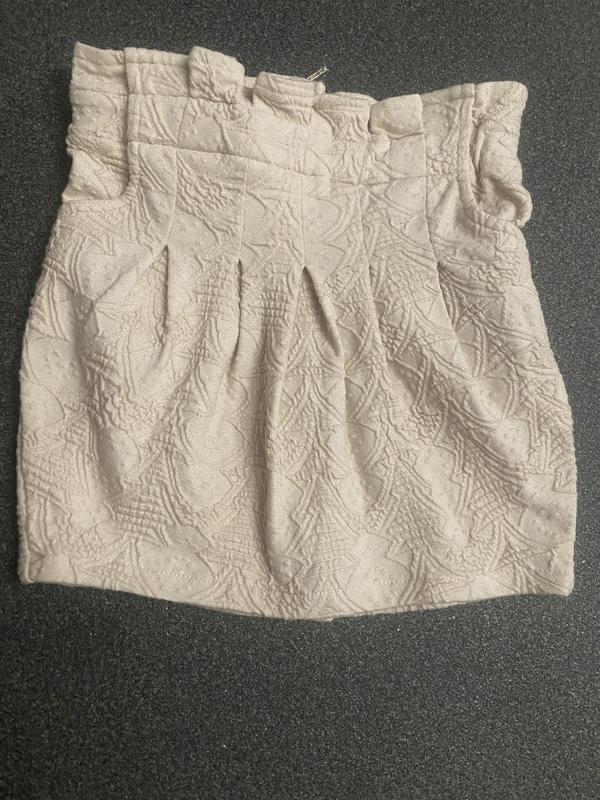 Стильна нарядна спідничка для дівчинки(1,5-2 роки)Гарний модний стильний пошив,прострочені складки.По бокам карманчики. В заді на замочку, Колір беж з перламутровою ниткою(фото не передає