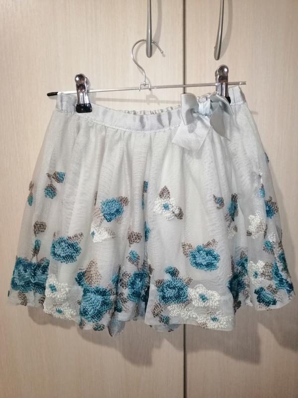 Красивая фатиновая юбка с богатой вышивкой. Есть три слоя ткани, последний - подкладка. На поясе - стильный бант.