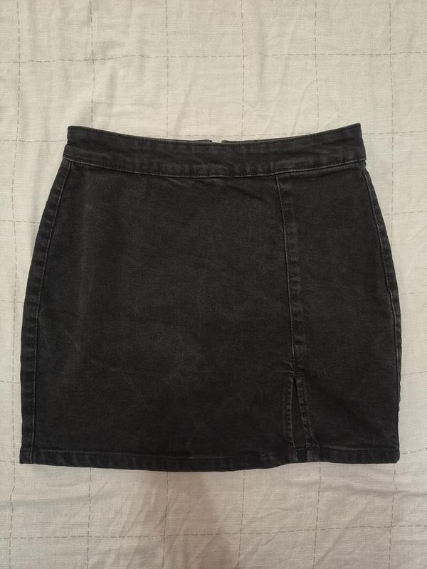 темно серая как черная мини юбка с разрезом спереди классная молодежная длина 26см пояс 33см поб 43см сзади на молнии стрейчева, тягнеться