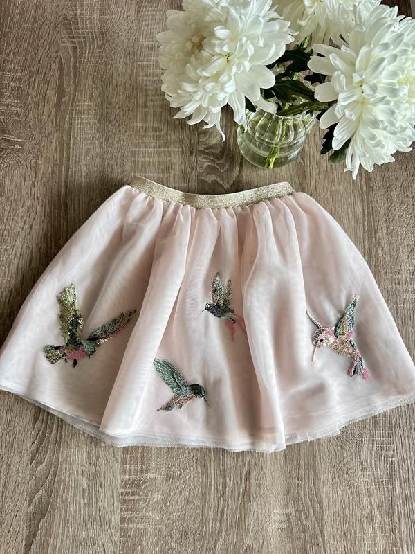Спідниця H&M святкова , зроблена з двійного фатину + підклад. Не просвічуєттая і гарно тримає форму . Спереду йде аплікація птахів . Дуже гарна , ніжно рожевого кольору. Збоку в кінці йде затяжка , але її майже не видно ( див фото 7) . В ціну враховано. На зріст -116/122/128 Довжина -33см Пот- 24,5 см